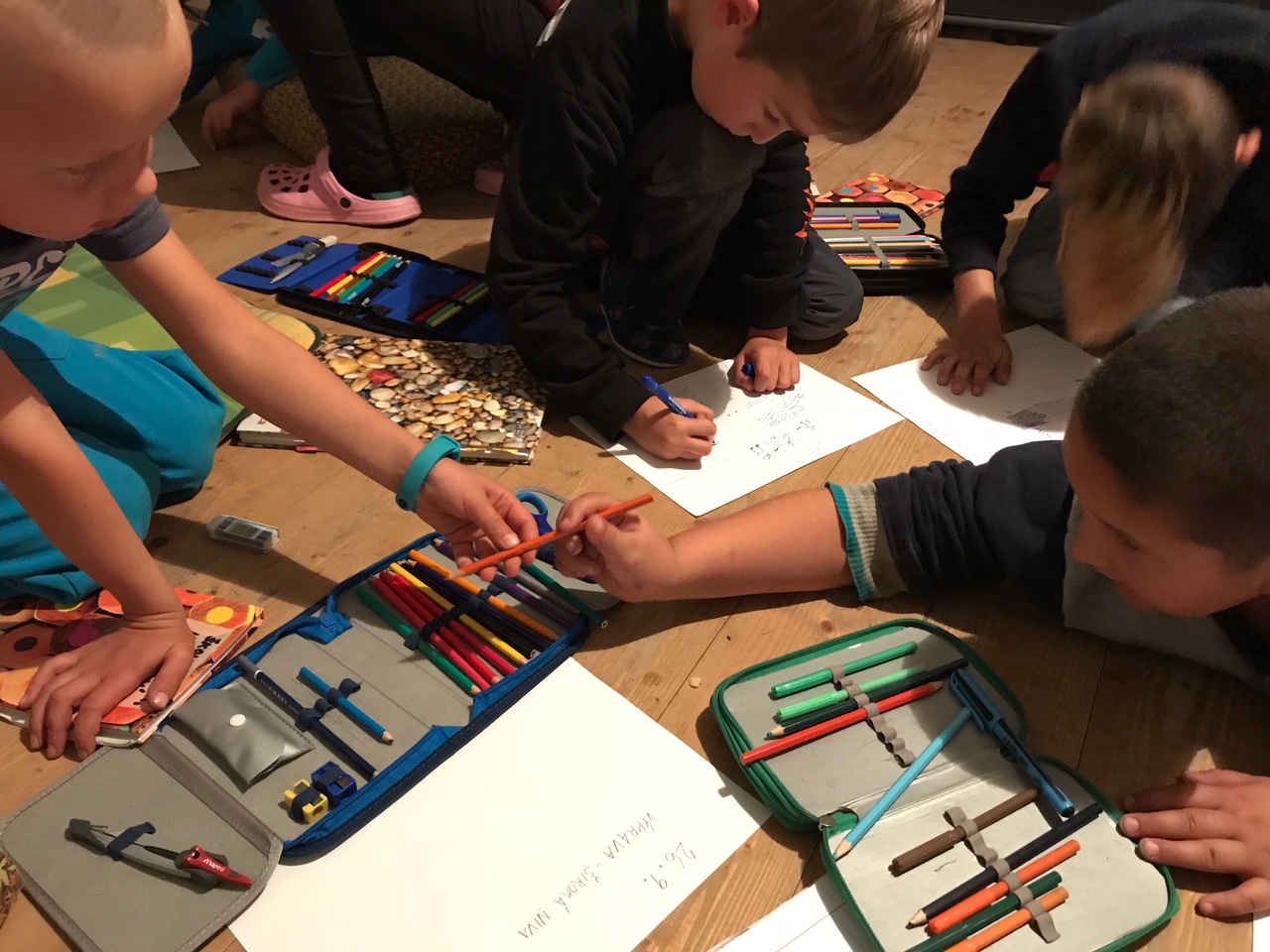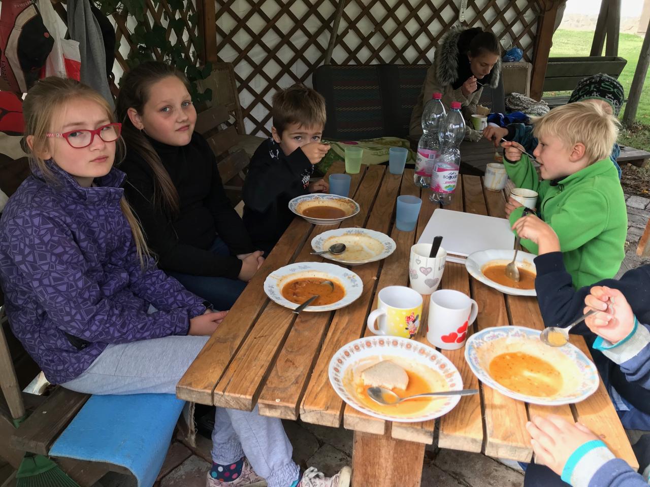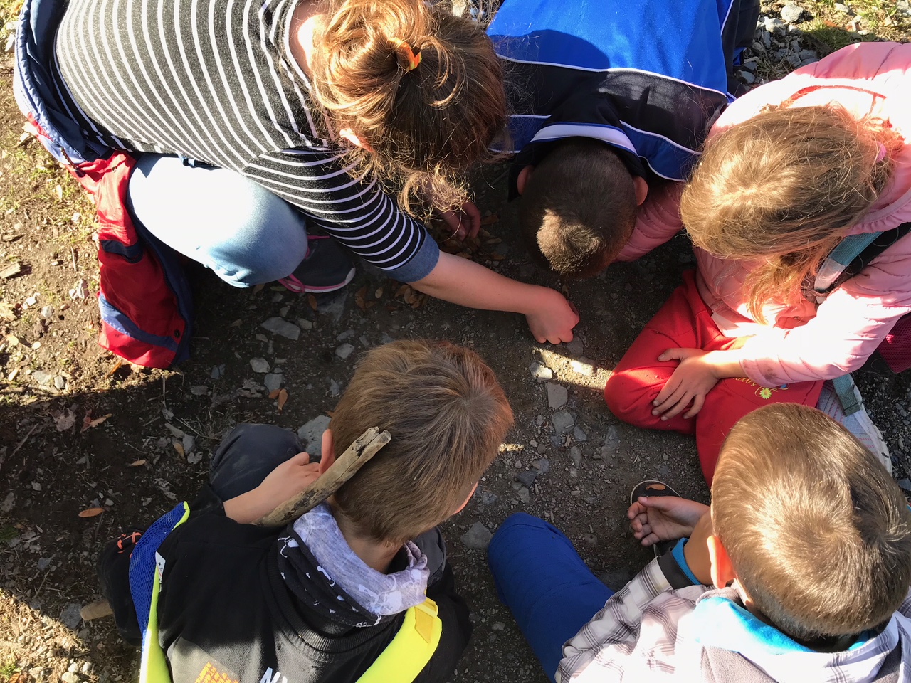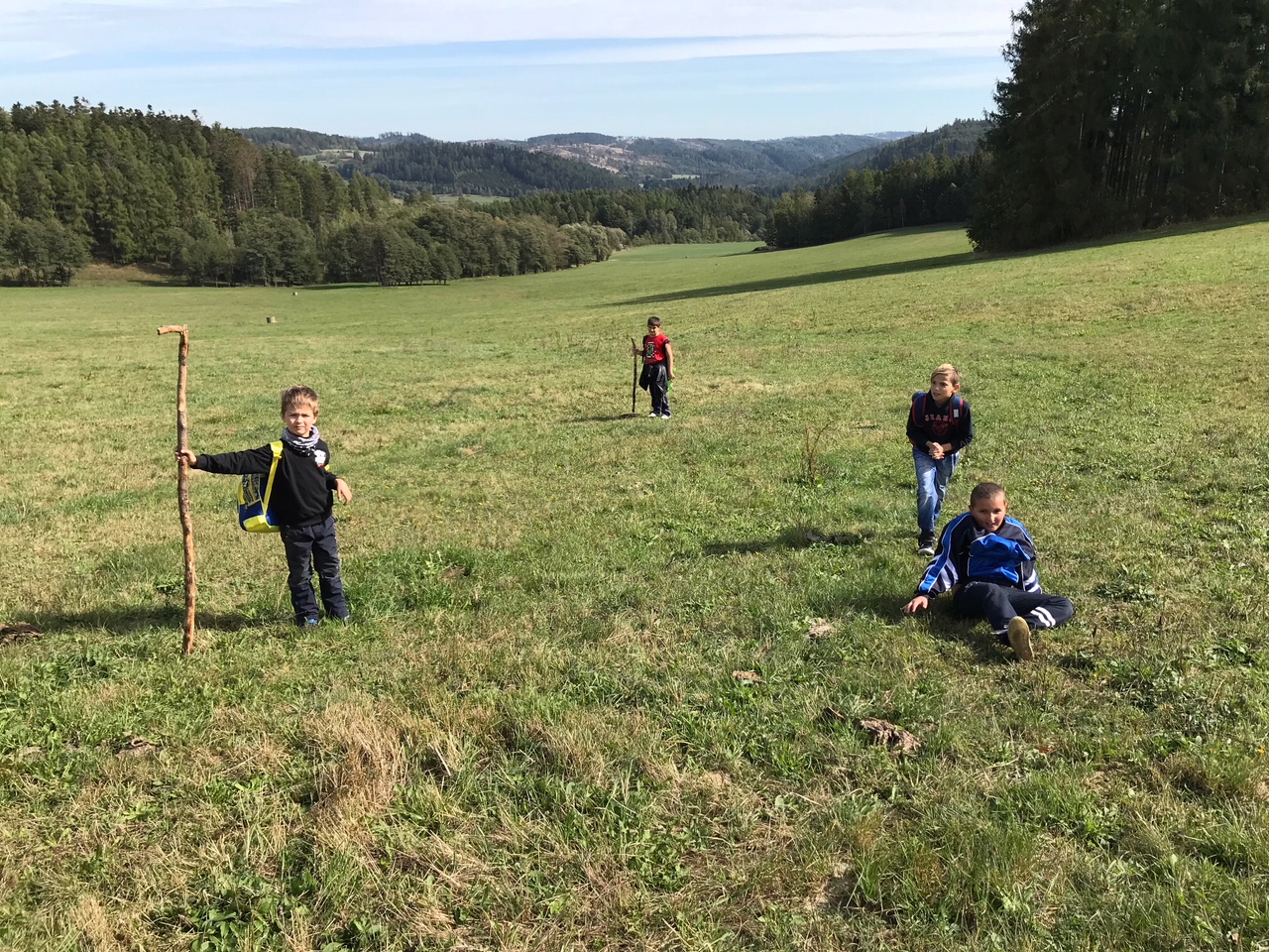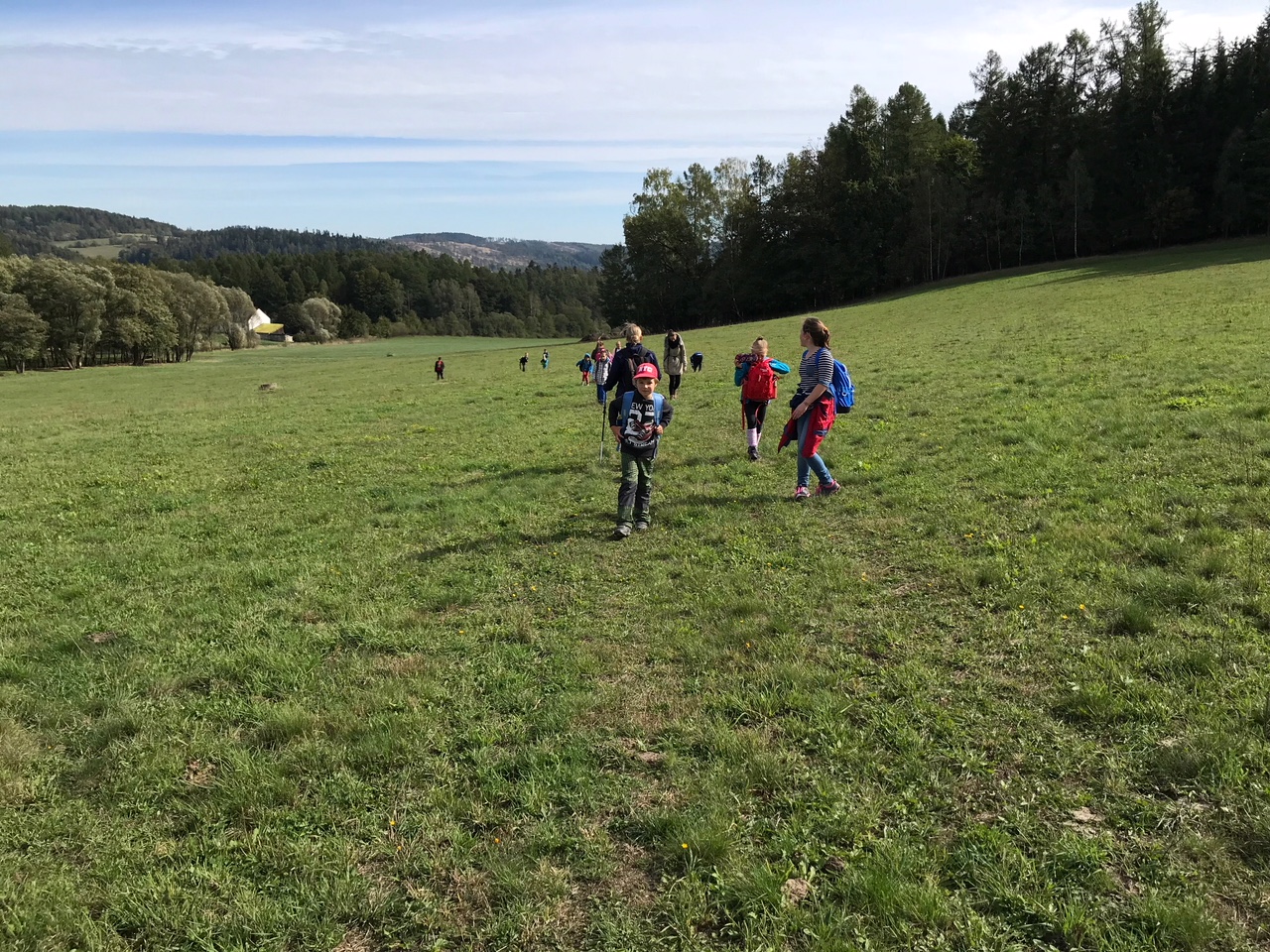 Počasí bylo baboletní a my stihli spoustu věcí: cestu vlakem a autobusem, procházku do kopce až k chalupě, výborný kotlíkový buřtguláš, pořádnou okružní túru kolem vrchu Špičáku, hru na slepé strážce, schovávanou po cestě lesem a stezku odvahy. Naučili jsme se, že při cestování si člověk musí dávat pozor na svá zavazadla, že žaludy mohou být zelené i hnědé, že každý strom se dá poznat podle listů, že změřit výšku stromu můžeme i bez toho, abychom na něj šplhali, a že když chceme stihnout autobus, je někdy potřeba i skočit přes potok. Děkujeme majitelům za možnost tohoto miniadapťáku a jejich laskavý servis.